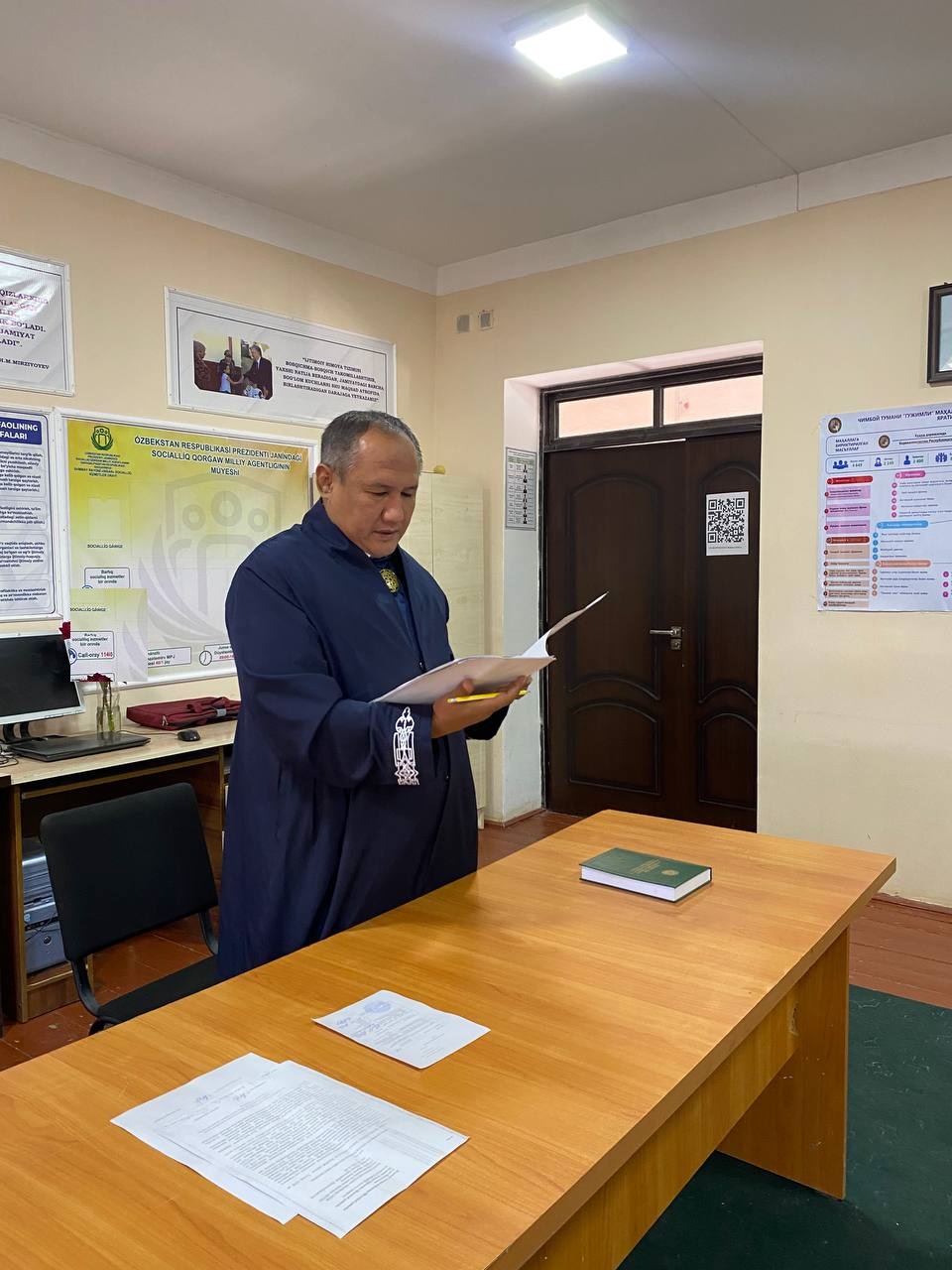 Jinoyat ishlari bo‘yicha Amudaryo tuman sudi raisi J. Baltabaev raisligida, sudya yordamchisi E. Jumaniyozov, Amudaryo tuman prokurorining katta yordamchisi hamda tuman IIO Probatsiya guruhi katta inspektori ishtirokida Amudaryo tumani “Boy ovul” mahallasi ma’muriy binosida ochiq sayyor sud majlisi tashkil etildi.